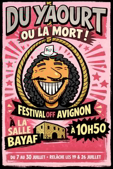Le spectacle “Du Yaourt ou la Mort!” sera joué pendant toute la durée du Festival OFF d’Avignon, du 4 au 25 juillet (relâche le 10 et 20 juillet) à la salle Bayaf (10 rue de la carretrie) du théâtre PIXEL, à 10h50
