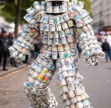 Pour réaliser le costume d’Homme Yaourt, Romain Chambon a travaillé, grâce au théâtre de Privas (07), avec l’artiste Eddy Ekete, l’Homme Canette et avec la participation des habitants de Privas pour la récolte des 1200 pots de yaourt !